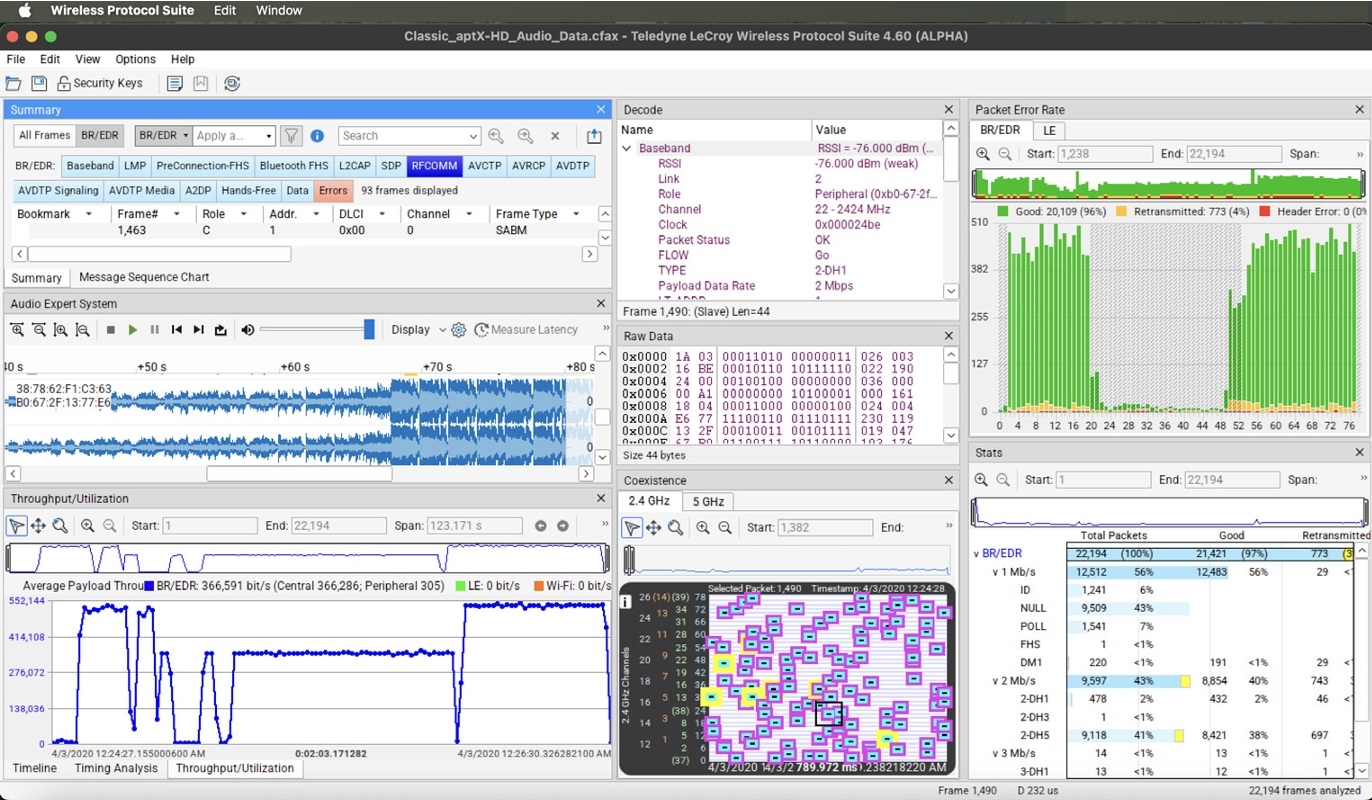 Teledyne LeCroy’s Wireless Protocol Suite combines Frontline’s decades of protocol analysis experience and up-to-the moment spec support with a streamlined interface, bringing all analysis tools into a single dockable framework that can be customized to your own preferred way of working and evaluating information. When paired with Teledyne LeCroy’s uniquely portable and configurable family of wireless protocol analyzers, the Wireless Protocol Suite delivers a world class software experience to anyone working with technologies that utilize the 2.4GHz ISM band.